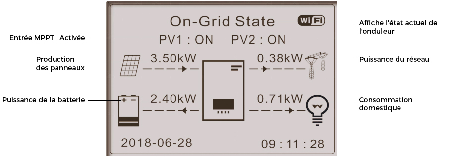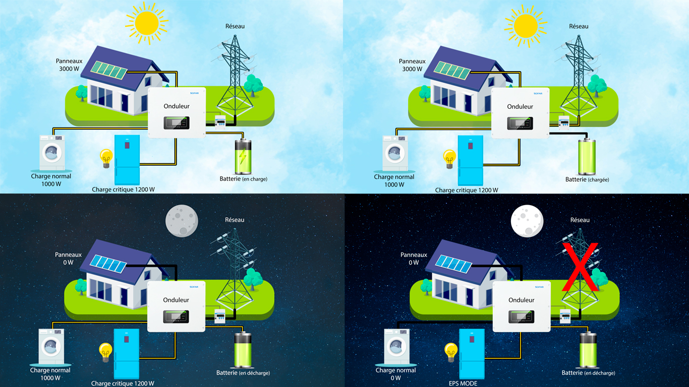 The solar panels (not included) generate electricity, which is converted into alternating current by the inverter. The excess energy is stored in the lithium battery. You can then use this stored energy when solar production is insufficient or during off-peak hours.