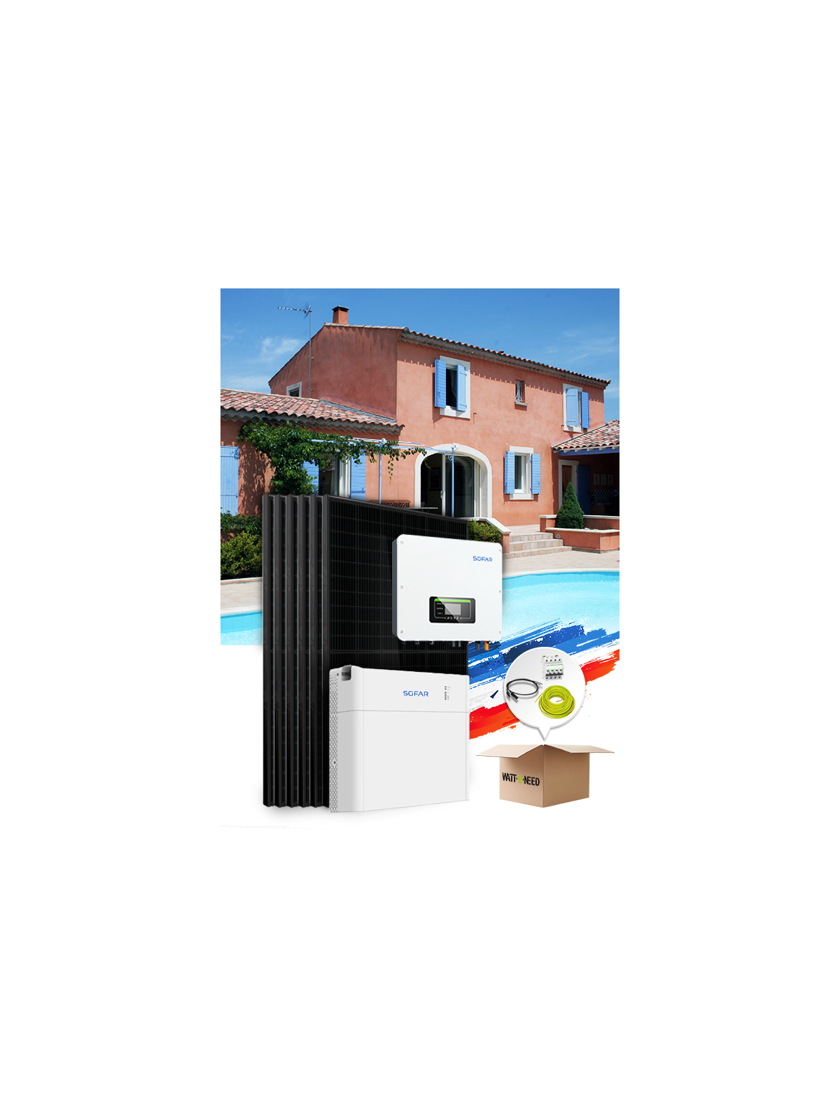 This complete solar kit is designed to allow you to produce your own electricity and significantly reduce your energy bill. It includes 18 high-performance solar panels, a Sofar 8 kVA three-phase hybrid inverter, and a 5 kWh lithium battery, offering an efficient and flexible self-consumption solution.