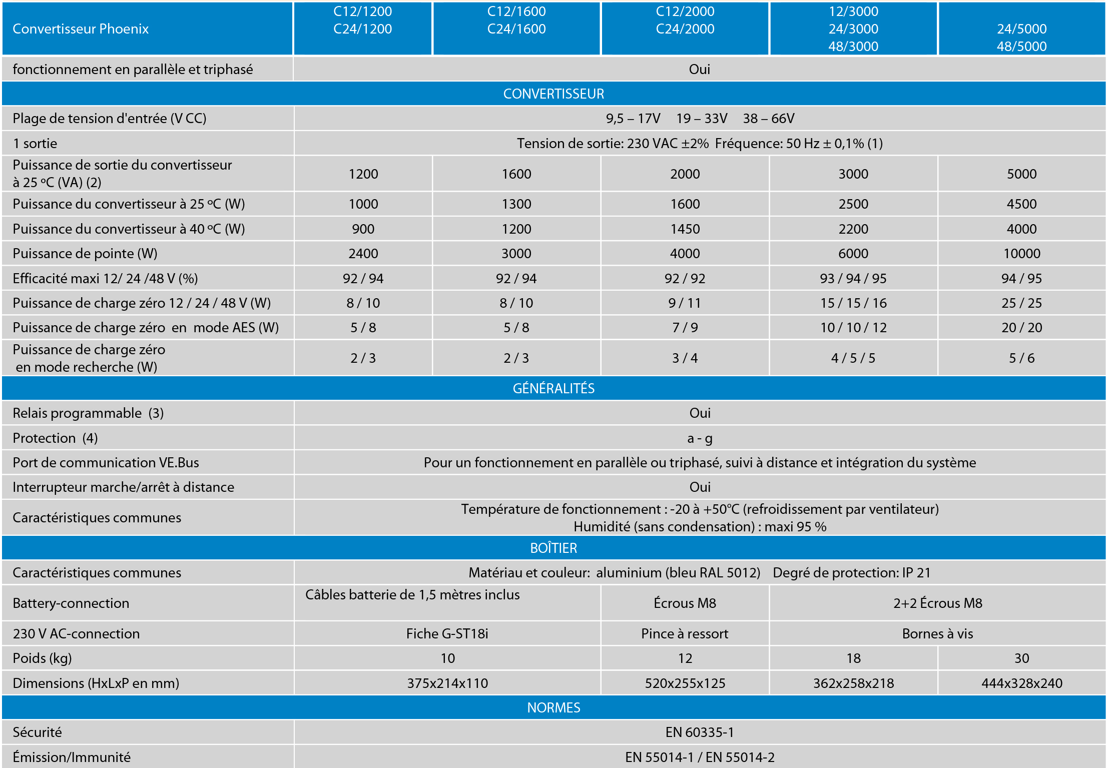 Victron Phoenix C 12/24/1200VA, C 12/24/1600VA, C 12/24/2000VA, 12/24/48/3000VA and 24/48/5000VA converters.