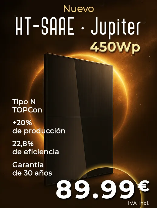 Panel solar bifacial N-Type TOPCon de 450 Wp. Tensión en circuito abierto: 39,68 V, potencia máxima: 32,87 V. Garantía del producto: 25 años, rendimiento: 30 años. Precio: 84,95 € IVA incluido.