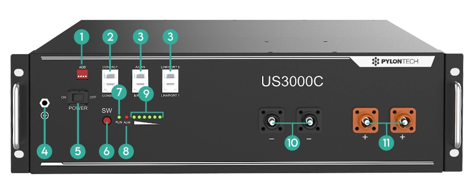 1 - ADD DipSwitch: sirve para definir la batería maestra y esclava.2 - Contacto /Consola3 - A/CAN - B/RS485: conexión utilizada para la comunicación con el inversor.4 - Link Port 0/1: permite la comunicación entre varias baterías en paralelo. 5 - Toma de tierra6 - POWER: interruptor de encendido ON - OFF7 - Start: arranque - apagado8 - Run: LED verde que parpadea o se enciende para indicar el estado de funcionamiento de la batería.9 - Alarma: parpadea para indicar que la batería está en alarma; se enciende para indicar que la batería está bajo protección. 10 - SOC: indicador luminoso que muestra la capacidad actual de la batería.11 - Terminales de alimentación negativos: uno se conecta al equipo, el otro se conecta en paralelo a otro módulo de batería para aumentar la capacidad.12 - Terminales de alimentación negativos: uno se conecta al equipo, el otro se conecta en paralelo con otro módulo de batería para aumentar la capacidad.