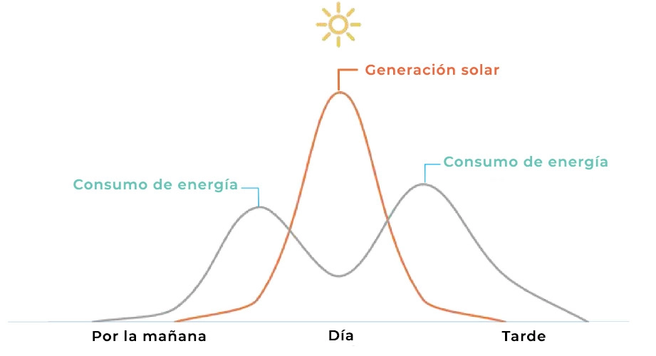 Hay una gran demanda de energía por la mañana y por la noche, pero la producción solar es más suficiente en las horas centrales del día.El sistema de almacenamiento en baterías equilibra la oferta y la demanda.