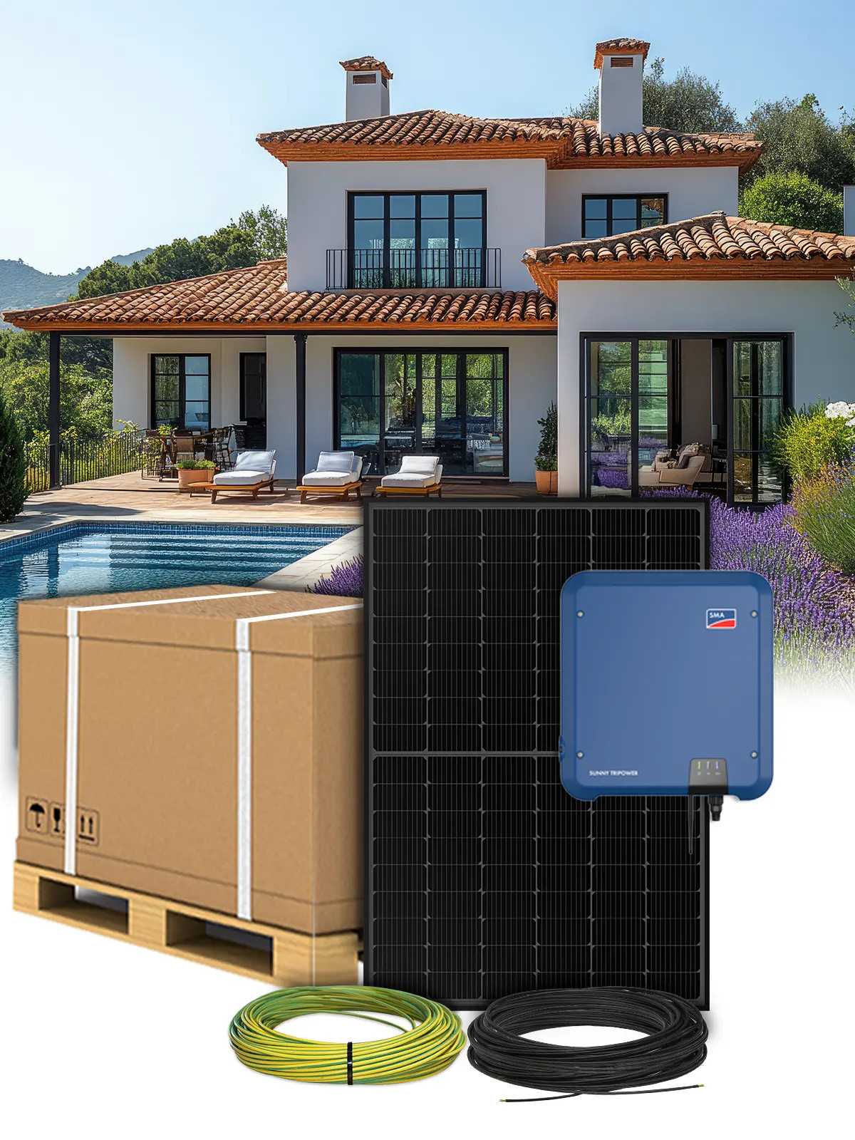 La composición básica del kit contiene 35 paneles solares, un inversor SMA sunny tripower STP 10.0 TL INT Blue, los cables solares para conectar los paneles al inversor y desde el inversor a su panel eléctrico, el sistema de montaje del panel está disponible como opción. (El sistema de montaje, así como el cableado y las protecciones se pueden modificar para satisfacer sus necesidades).