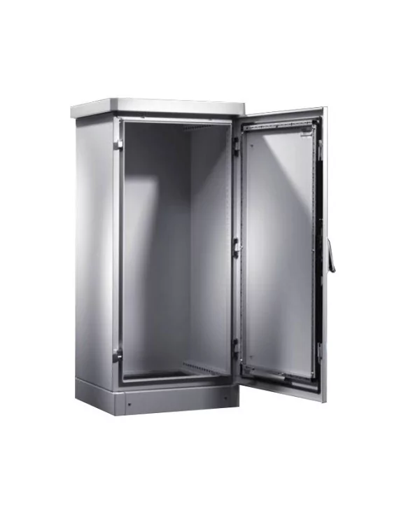 Baie outdoor avec socle de transport de 100 mm et toit antipluie dépassant de tous les côtés.