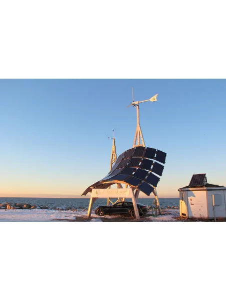La Giraffe 2.0 par InnoVentum est un carport et une station de charge combinés qui récupèrent l'énergie verte produite par le vent et le soleil pour alimenter votre véhicule électrique.