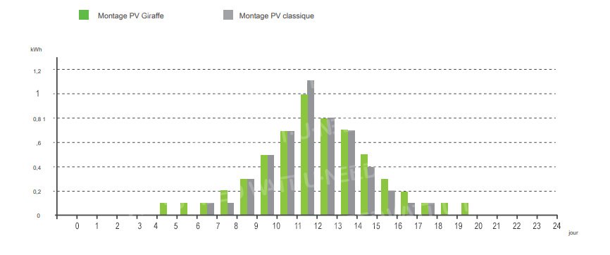 Grâce au positionnement intelligent (soigneusement calculé) des panneaux photovoltaïques, la Giraffe 2.0 commence à produire de l'énergie solaire 2 heures plus tôt et s'arrête 2 heures plus tard qu'un montage PV classique, évitant une production maximale à midi et produisant de l'énergie sur une plus longue période