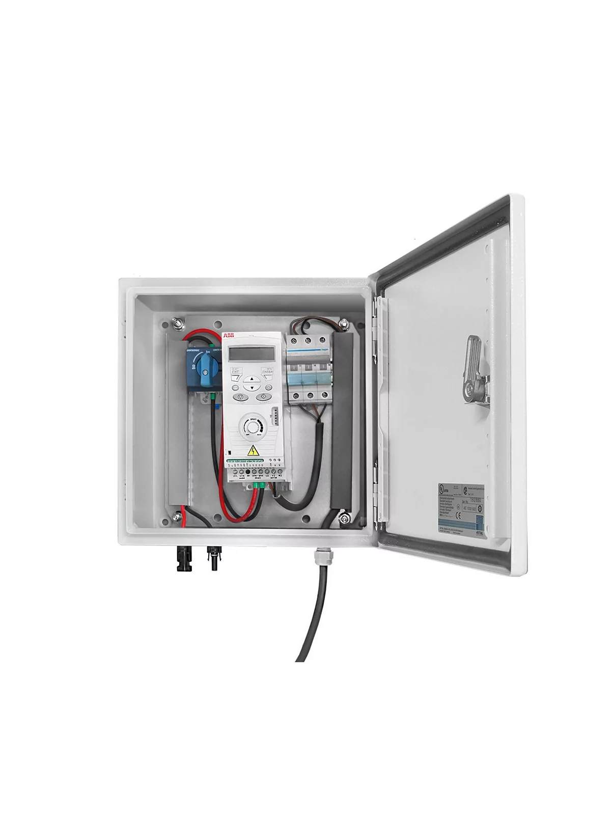 La puissance du variateur ABB doit être adaptée à la pompe (à choisir dans les options du produit en haut de page). Le nombre et la puissance des panneaux photovoltaïques doit aussi être adapté à cette puissance.