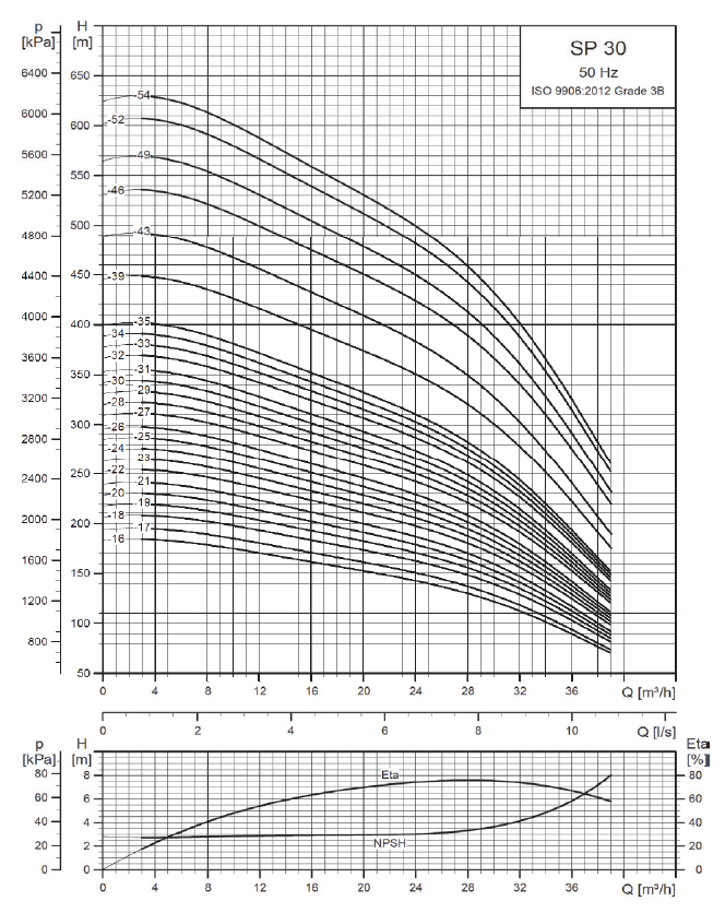 Les pompes SP 30 sont conseillées pour un rendement de 75% à une hauteur entre 5m et 275m pour un débit entre 24m³/h et 32m³/h.