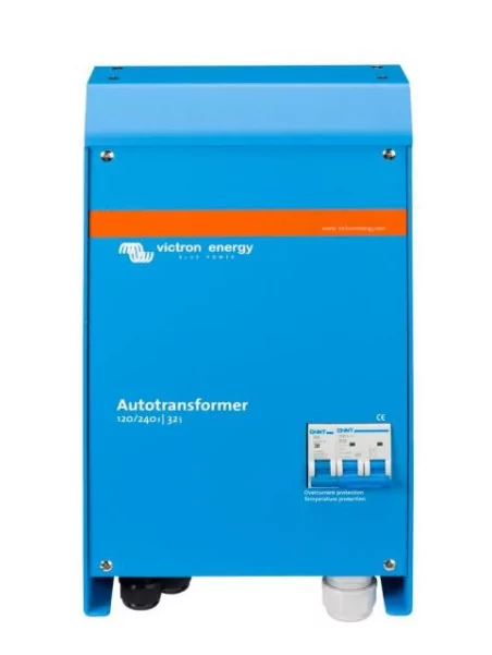 En mode convertisseur, la sortie du neutre du convertisseur/chargeur doit être connecté au sol pour assurer un fonctionnement correct du disjoncteur différentiel (GFCI). En cas d’alimentation de phase auxiliaire, le neutre devra être relié à la terre. Dans ce but, un relais de terre est monté sur le boîtier de l’autotransformateur. Le relais est contrôlé par le Multi ou Quattro de 230/240 V. (Le relais de terre interne du Multi ou Quattro de 230/240 V doit être hors circuit.)