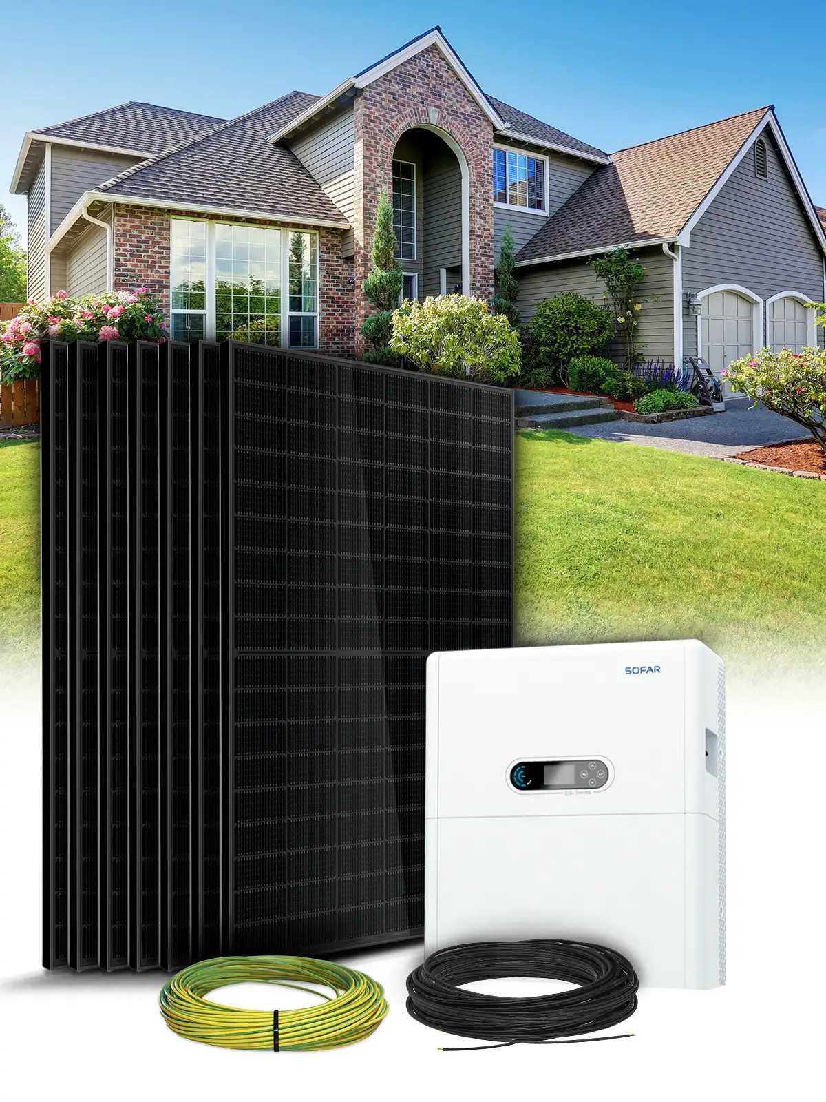 De basis samenstelling van de kit bevat 14 zonnepanelen, een hybride omvormer Sofar Solar ESI 4.6 kVA - ESI-4.6K-S1, een lithiumbatterij Sofar Solar BTS 5K, de zonnebekabeling om de panelen met de omvormer te verbinden, het montagesysteem voor de panelen is optioneel beschikbaar. (Het montagesysteem evenals de bekabeling en beveiligingen zijn aanpasbaar om aan uw behoeften te voldoen).