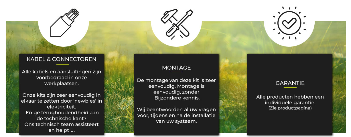 Het basispakket bevat 9 zonnepanelen, een WKS Evo Circle Pro 6,5 kVA 48V hybride omvormer, vier 200Ah ultracell batterijen, zonnekabels om de panelen met de omvormer te verbinden en het paneelmontagesysteem is optioneel verkrijgbaar. (Zowel het montagesysteem als de bekabeling en beveiligingen kunnen naar wens worden aangepast).